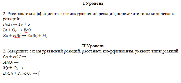 2. Расставьте коэффициенты в схемах уравнений реакций, определите типы химических реакций:
