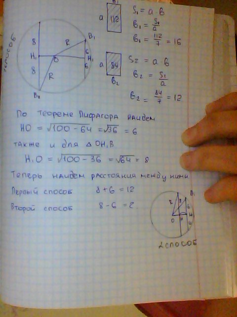 радиус основания цилиндра равен 10см, а высота 7 см. В цилиндре проведены два сечения,параллельные между собой и параллельные оси. Площади этих сечений 112 и 84 см. Найдите расстояние между сечениями