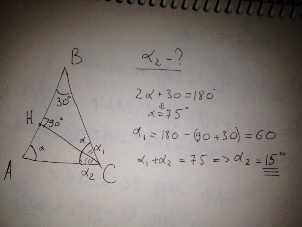 угол при вершине равнобедренного треугольника равен 30,на боковую сторону опущена высота.найдите угол между этой высотой и основанием ответы которые могут быть 1)15 градусов 2)45 градусов 3)75 градусов 4)20 градусов 5)65градусов