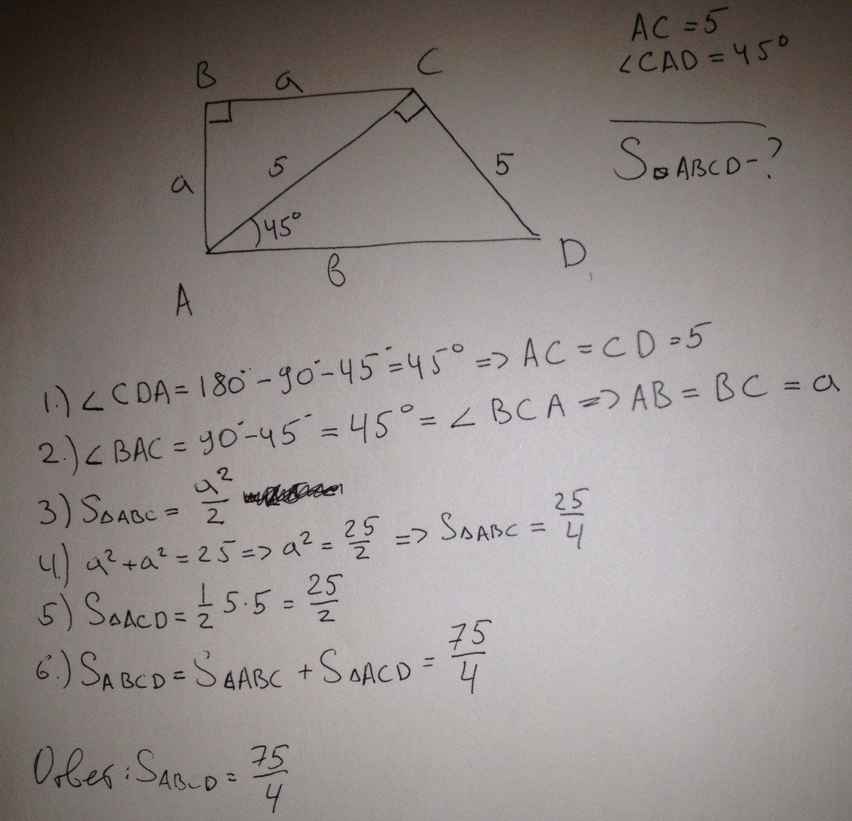 в прямоугольной трапеции диагональ,перпендикулярная большей боковой стороне,равна 5 см и составляет с большим основанием угол 45 градусов.найдите площадь трапеции