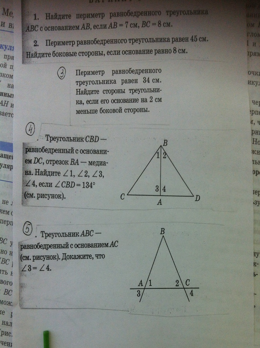 5. Углы при основании (1 и 2) равны, угол 3 и 4 являются вертикальными углам 1 и 2, значит они равны (не уверенна, но по другому объяснить не могу)