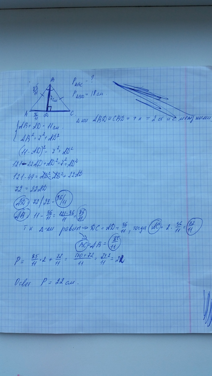 1. В равнобедренном треугольнике АВС к основанию АС проведена биссектриса BD равная 7 см Найдите пириметр треугольника АВС если периметр треугольника ABD равен 18 см
