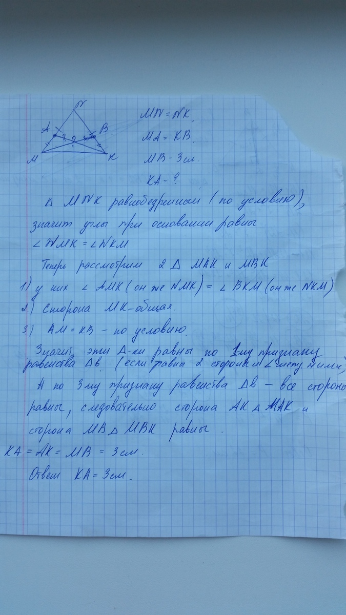 2. В треугольнике MNK на равных сторонах MN и NK выбраны точки А и В соответственно так что МА = KB найдите длину отрезка KA если MB = 3 см