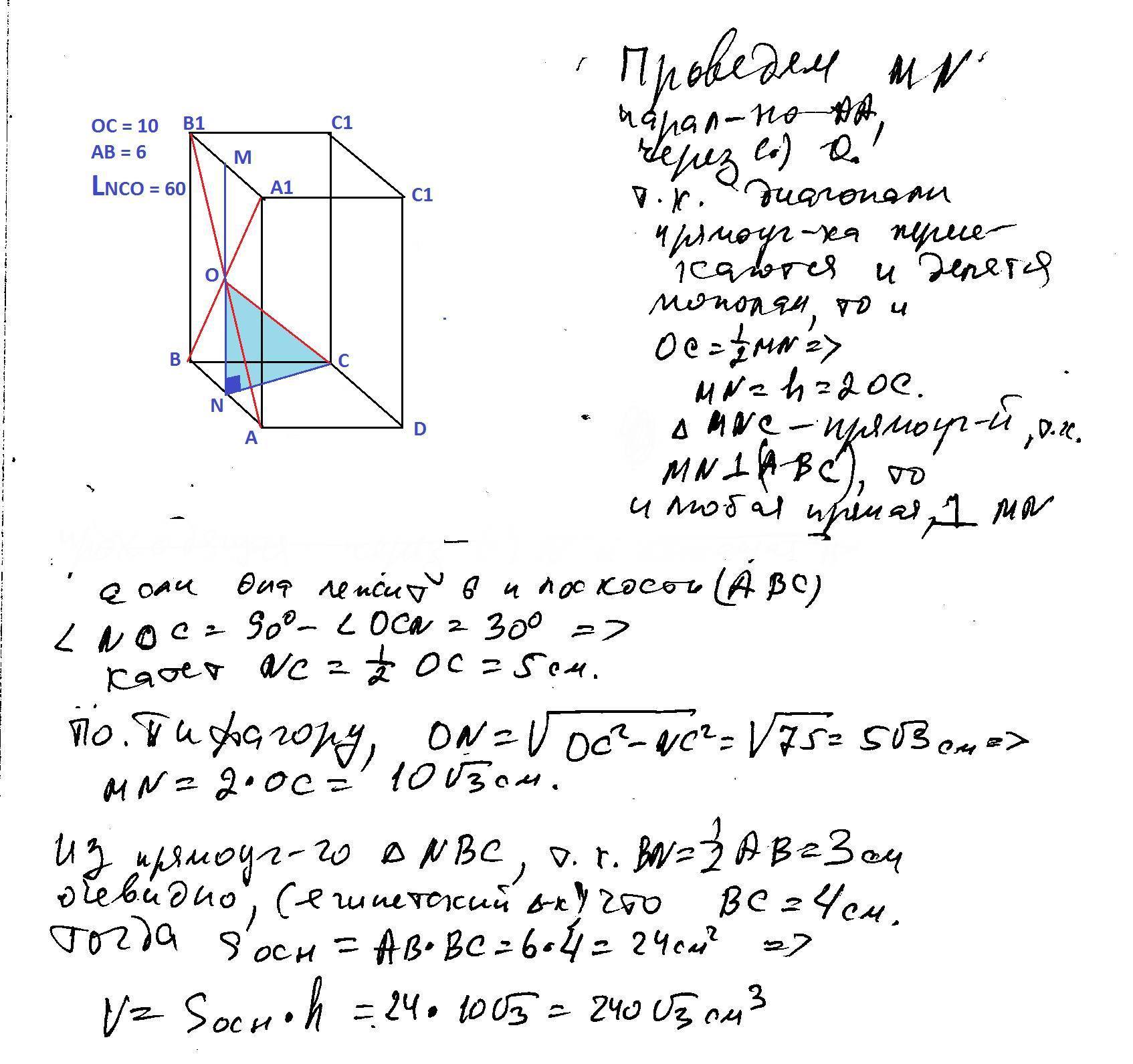 В прямоугольном параллелепипеде ABCDA1B1C1D1, AB=6 см, точка O-точка пересечения диагоналей грани AA1B1B, OC=10см. Градусная мера угла наклона отрезка OC к плоскости ABC равна 60(градусов). Вычислите объём параллелепипеда ABCDA1B1C1D1.