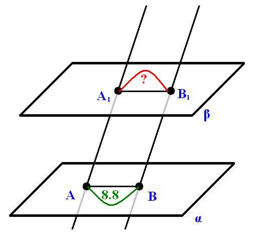 Отрезки параллельных прямых, заключенные между параллельными плоскостями, равны ⇒ АА₁=ВВ₁. По условию, также АА₁||ВВ₁. Если в четырехугольнике две стороны равны и параллельны, то этот четырехугольник - параллелограмм. Значит, АА₁В₁В - параллелограмм. Так как в параллелограмме противоположные стороны равны, то А₁В₁=AB=8,8 см