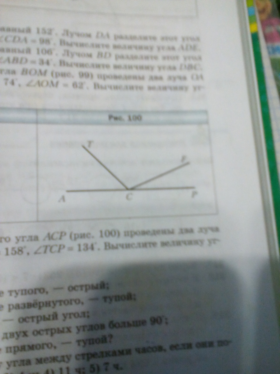 Из вершины развёрнутого угла ACP проведены два луча CT и CF так, что угол ACF = 158 гр., угол TCP = 134 гр. Вычислите величину угла TCF.