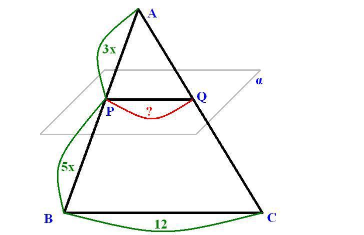 Так как плоскость параллельна прямой ВС, то и любая прямая (в том числе РQ) параллельна прямой ВС. Так как РQ||ВС, то соответственные углы АPQ и АВС равны. Тогда треугольники АВС и АPQ подобны по двум углам (угол А - общий). Отношение сходственных сторон: