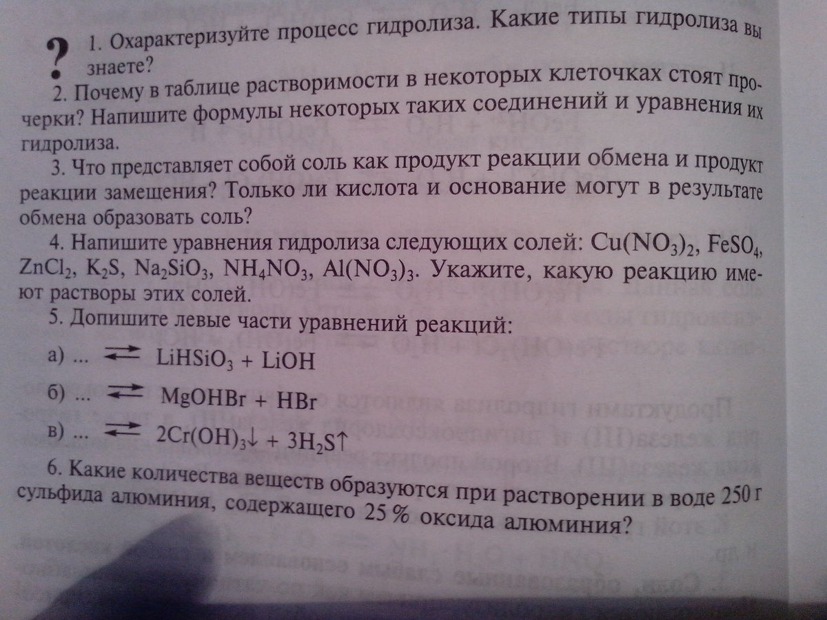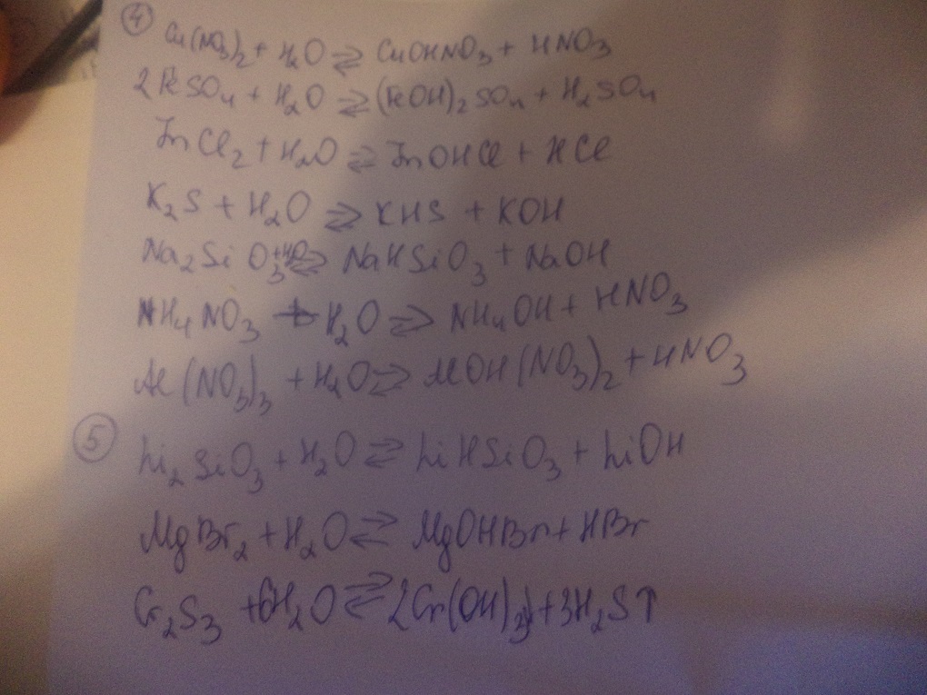 Здравствуйте, ответ на задание во вложении.забыла написать среду в уравнениях, 1) кислая, 2)кислая, 3) кислая, 4) щелочная 5)щелочная, 6) кислая, 7)кислая.