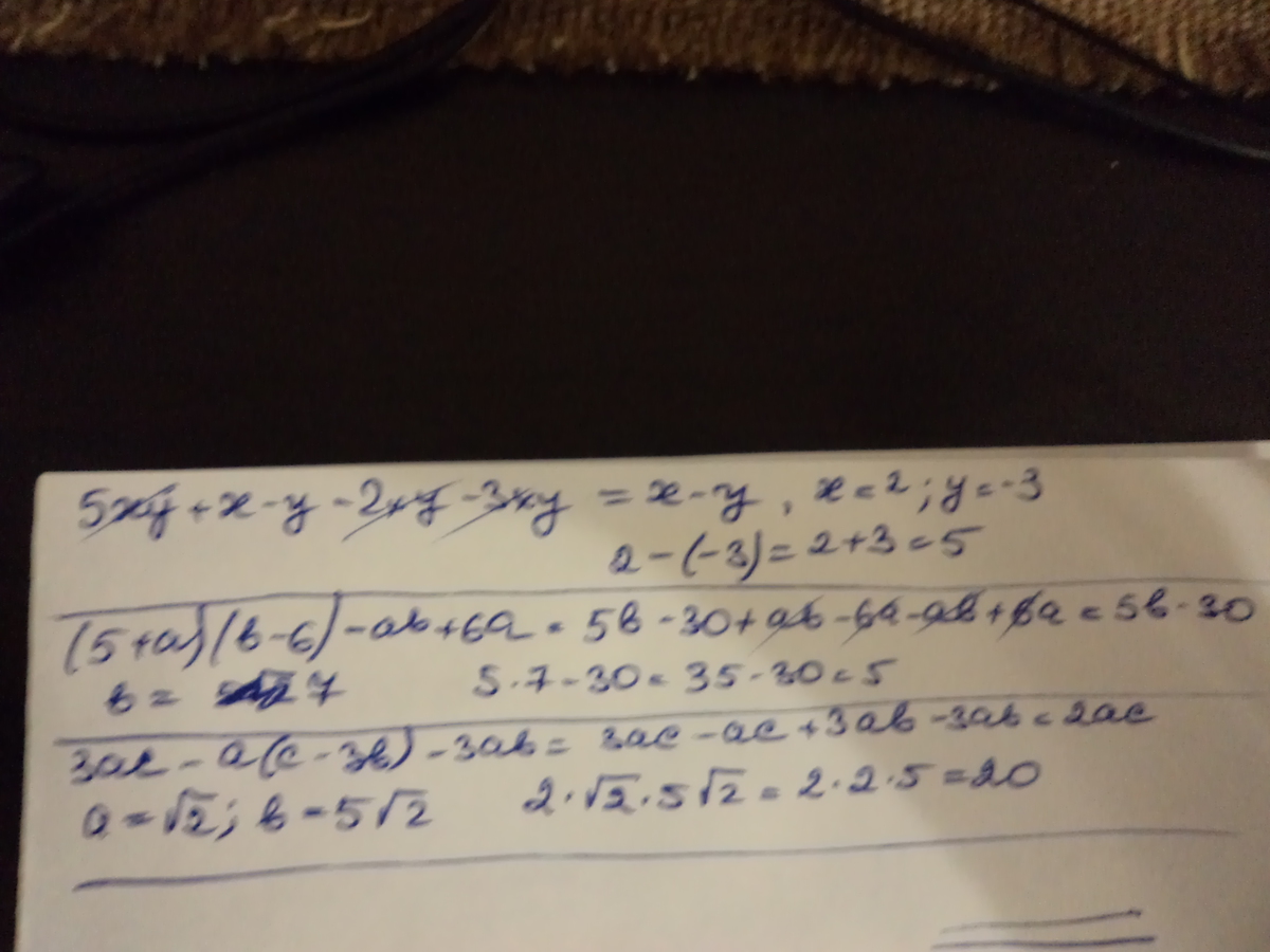 (5+a)(b-6)-ab+6a при a=3+4 в корне 7,b=7