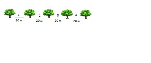 2) Между первым и пятым деревьями 4 промежутка по 20 метров (смотрите рисунок), значит расстояние между ними составляет: