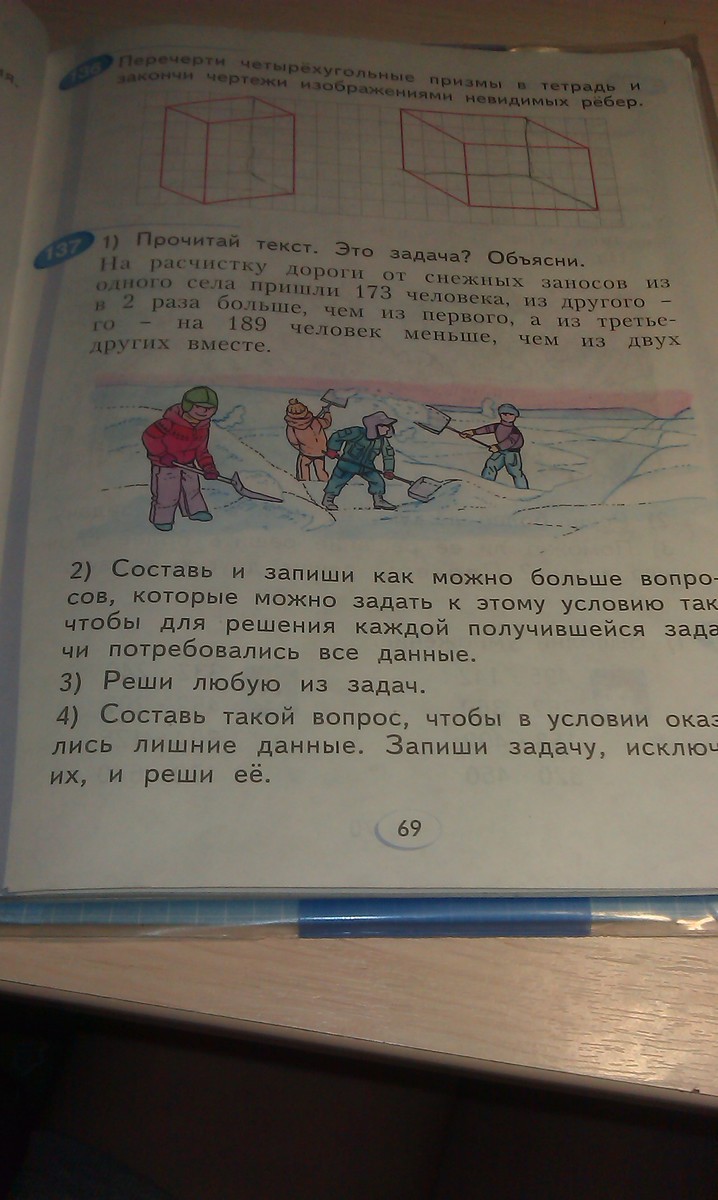 2)Вопросы: Сколько человек пришло из 3го села? Сколько всего чел. пришло убирать снег? На сколько человек из 2го и 3го села больше, чем из 1?