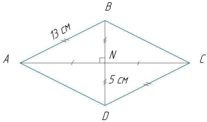 Сторона ромба равна 13см, а одна из его диагоналей - 10см . Найдите длину другой диагонали ромба.