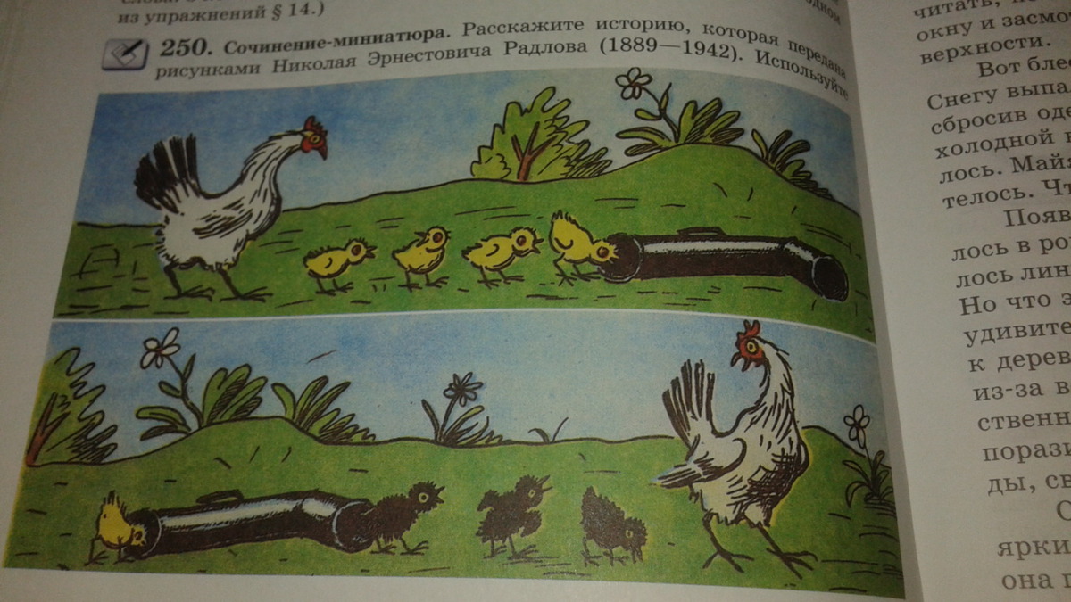 Однажды летом я поехал(а) к бабушке в деревню . У нее есть и куры, и коровы, и козы, кролики и даже свинки. Побыв там пару недель, я пошел(ла) следить за тем как кушают курицы, петухи и их цыплятки. Через мгновение бабушка выпустила кур и я начал(а) следить за ними. Как ни странно, во дворе лежала старая, грязная труба. Молодой петух вел цыплят прямо к этой трубе. Они подошли к ней, и на лице у них застыл вопрос:"Что это?". Так как цыплятам было интересно что это и что там внутри, они соответственно не медля полезли в трубу. Через пару десятков секунд оттуда вылезли чумазенькие черные комочки, у которых едва было видно желтый пух. Увидев это, я рассказал(а) это бабушке. Мы долго обсуждали цыплят, смеялись, и я был(а) рад(а) что мы просто посидели и поговорили с моей любимой бабушкой
