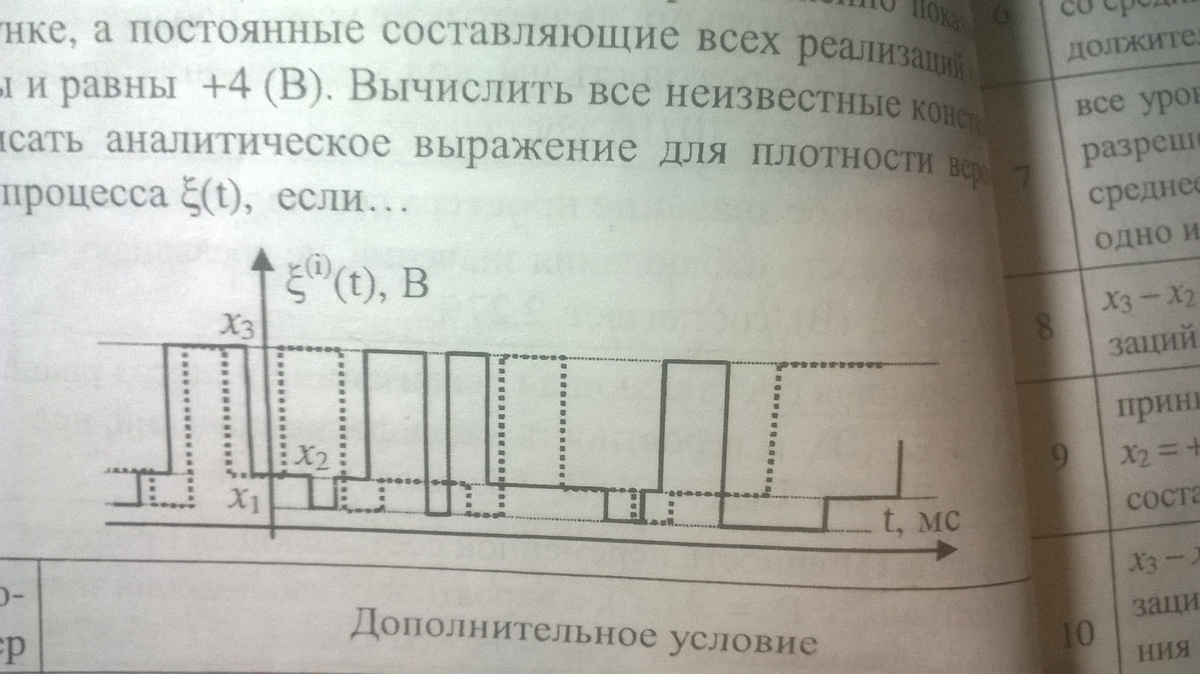 Эргодический случайный процесс в каждый момент времени принимает какое-то одно из трех разрешенных значений. Форма реализации этого процесса приближенно показана на рисунке, а постоянные составляющие всех реализаций одинаковы и равны +4 Вольта. Вычислить все неизвестные константы и записать аналитическое выражение для плотности вероятности процесса кси(t), если все уровни x1 x2 x3 больше нуля, каждый последующий разрешенный уровень вдвое больше предыдущего, а среднее время прибывания реализации на каждом уровне одно и то же.