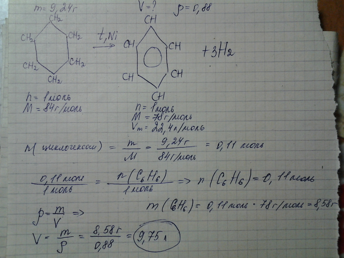из циклогексана массой 9,24г по реакции дегидрирования в присутствии никелевого катализатора получен бензол. рассчитайте объем бензола, если его плотность расна 0,88