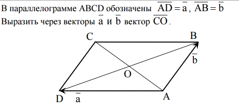 overline {AC}=overline {AD}+overline {AB}\\overline {OC}=frac{1}{2}overline {AC}; ; to ; ; overline {CO}=-overline {OC}=-frac{1}{2}(overline{AD}+overline{AB})=-frac{1}{2}(overline {a}+overline {b})