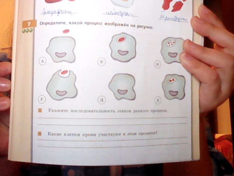 Определите, какой процесс изображён на рисунке. Укажите последовательность этапов данного процесса.Какие клетки крови участвуют в этом процессе?