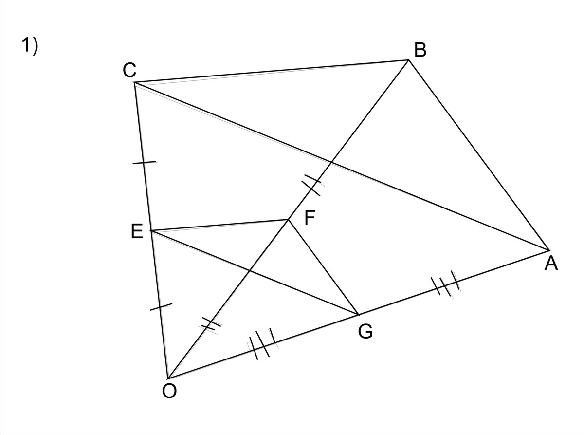 поскольку E,F и G середины сторон ОС, ОВ и ОА соответственно, то EF - средняя линия треугольника ОСВ, FG - средняя линия треугольника ОВА, EG - средняя линия треугольника ОСА. Значит EF || CB, FG || BA, EG || CA. Значит EF, FG, EG || плоскости СВА. Так как EF, FG, EG лежат в одной плоскости, то плоскость СВА || EFG.