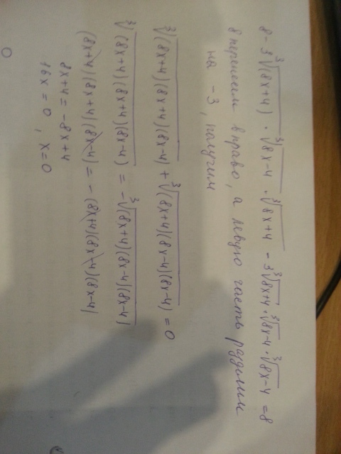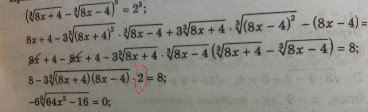 не получается загрузить фото.Уравнение таково: корень кубический из 8х+4 минус корень кубический из 8х-4 равно 2