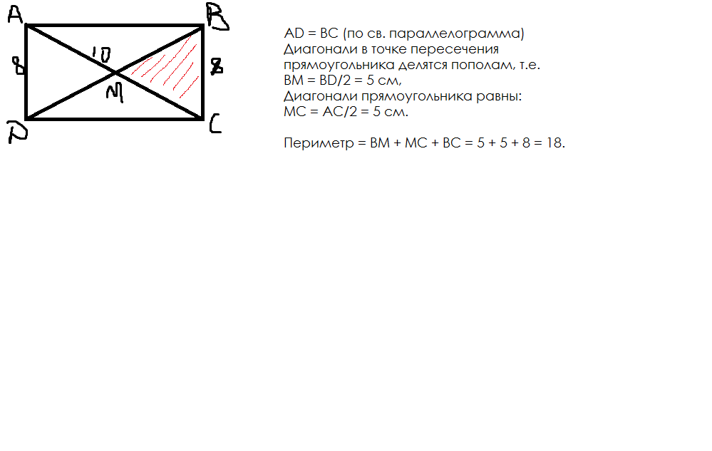В прямоугольнике abcd диагонали пересекаются в точке м. Найдите периметр треугольника bmc , если сторона ad ровна 10 см
