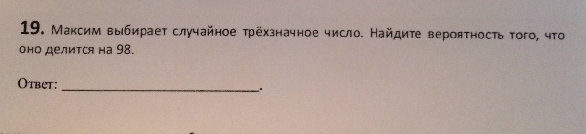 Максим выбирает случайное трехзначное число. Найдите вероятность того что оно делится на 98.