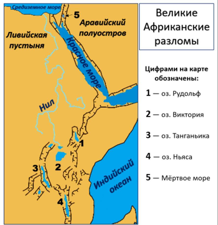 Географические объекты,которые образовались на месте наибольшего тектонического разлома в земной коре Африки.