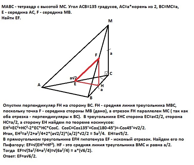 MABC - тетраэдр с высотой MC. Угол ACB=135 градусов, AC=a*корень из 2, BC=MC=a, E - середина АС, F - середина MB. Найти EF.