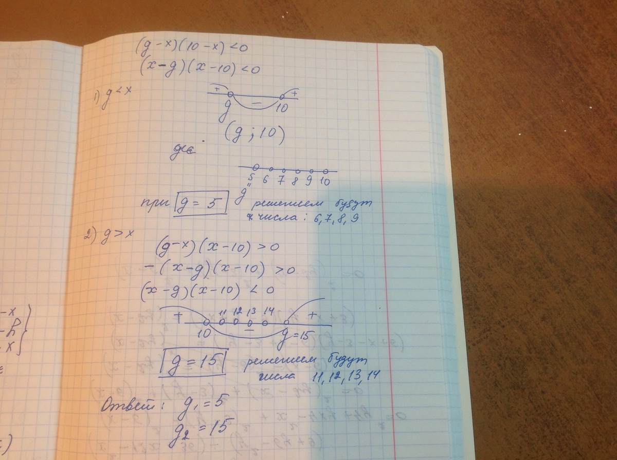 Укажи такое натуральное значение параметра g, при котором множество решений неравенства (g−x)(10−x)<0 содержит четыре натуральных числа.