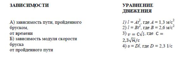 Ученик исследовал движение бруска по наклонной плоскости. Он определил, что брусок, начиная движение из состояния покоя, проходит 20 см с ускорением 2,6 м/с^2. Установите соответствие между физическими величинами, полученными при исследовании движения бруска (см. левый столбец), и уравнениями, выражающими эти зависимости, приведёнными в правом столбце. К каждой позиции первого столбца подберите соответствующую позицию второго столбца и запишите в таблицу выбранные цифры под соответствующими буквами.