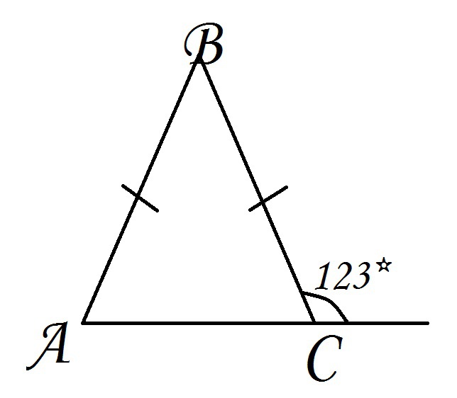 в треугольнике АВС стороны АВ и ВС равны, а внений угол при вершине С равен 123. Найдите величену угла В