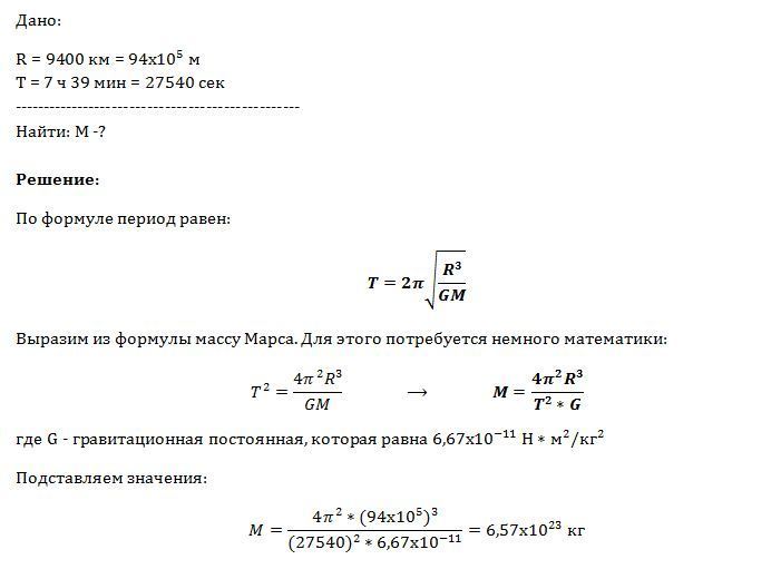 фобос -спутника планеты Марс. Он обращается вокруг Марса по орбите радиусом 9400 км . Период его обращения 7 ч 39 мин . найдите массу Марса . за рание спасибо срочно до завтра