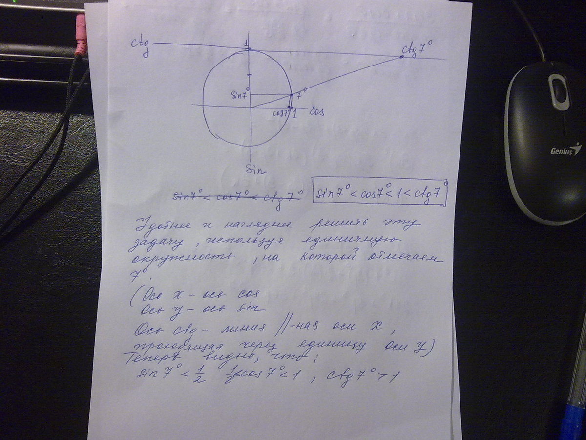 найти на единичной окружности число 7, абсцисса этой точки - косинус, ордината - синус, они оба меньше единицы, косинус больше, отсюда получаем ответ синус 7, косинус 7, 1, котангенс 7