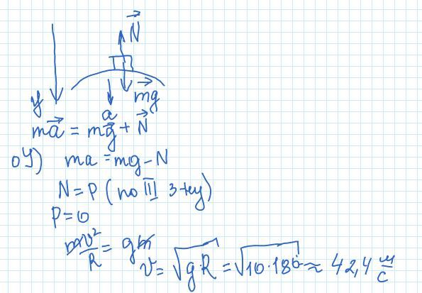 ПОМОГИТЕ ОЧЕНЬ НАДО определите с какой скоростью должен ехать по выпуклому мосту мотоциклист масса которого с мотоциклом 310 кг чтобы сила давления на мост равнялась 0 Радиус кривизны моста 180м