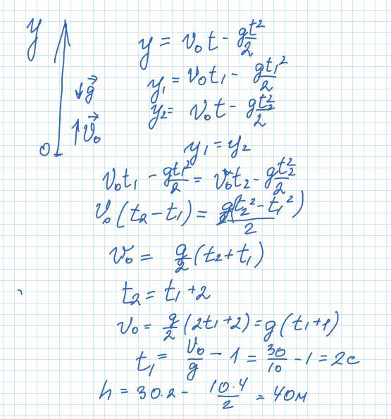 Тело брошено вертикально со скоростью 30 м/с. В некоторой точке А тело побывало дважды с интервалом 2с. Определите высоту, на которой находиться точка А. /Прошу показать полное решение задачи/