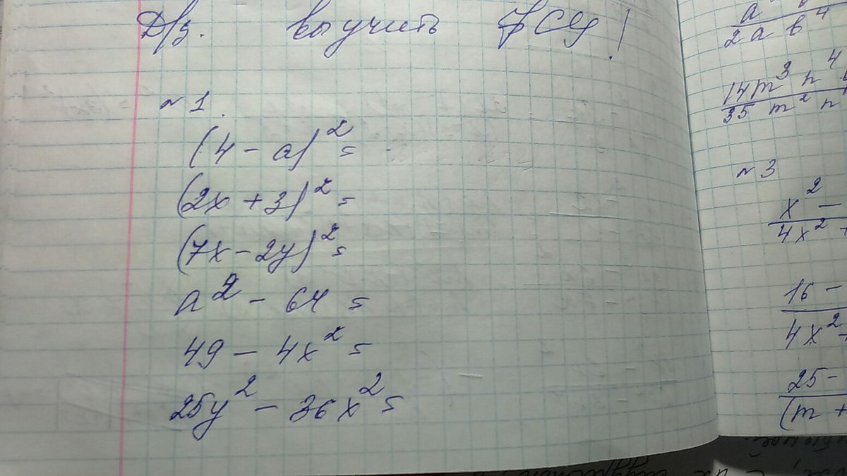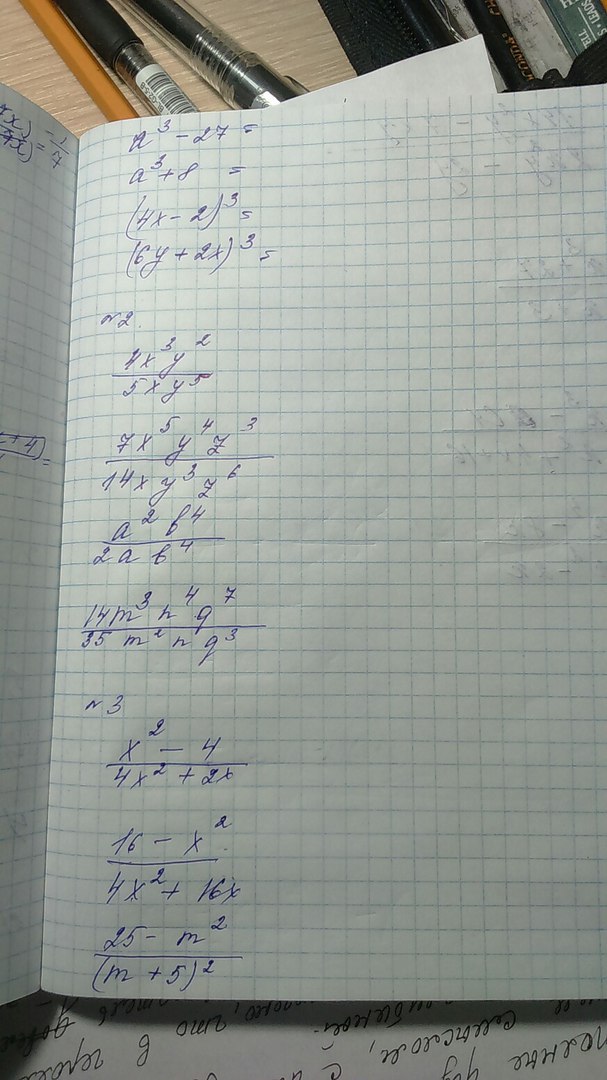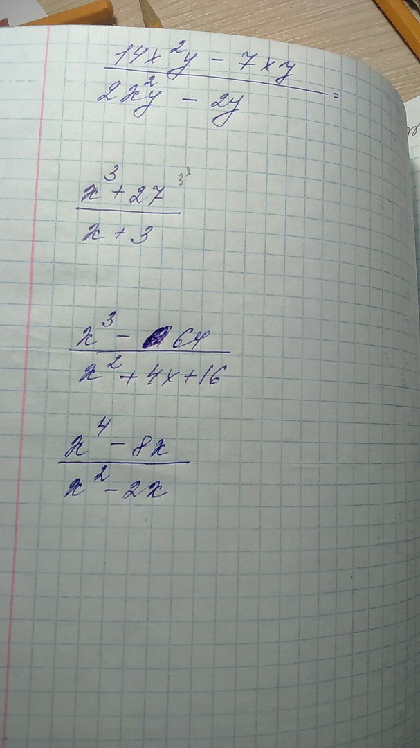 frac{14x^2y-7xy}{2x^2y-2y}= frac{7xy(2x-1)}{2y(x^2-1)}= frac{7x(2x-1)}{2x^2-2}; \  frac{x^3+27}{x+3}= frac{(x+3)(x^2-3x+9)}{x+3} =x^2-3x+9  \  frac{x^3-64}{x^2+4x+16}= frac{(x-4)(x^2+4x+16)}{(x^2+4x+16)}=x-4 \  \  frac{x^4-8x}{x^2-2x}= frac{x(x-2)(x^2+2x+4)}{x(x-2)} =x^2+2x+4 \  \  (4-a)^{2}=16-8a-a^2 \  \  (2x+3)^{2} =4x^2+12x+9 \  \  (7x-2y)^{2}=49x^2-28xy+4y^2   \  \  (a^2-64)=(a-8)(a+8) \  \ 49-4x^2=(7-2x)(7+2x) \ <br /> \  25y^2-36x^{2}=(5y-6x)(5y+6x)