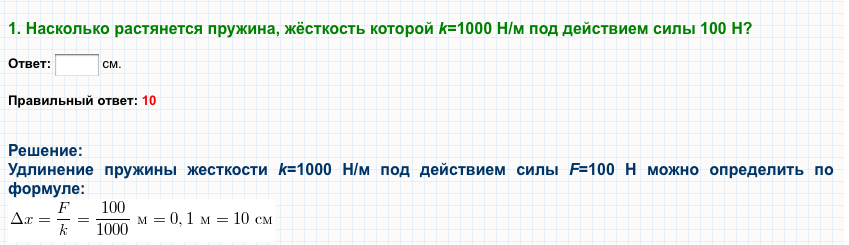 Задача 2. Каково будет удлинение пружины жесткостью k=104 Н/м под действием силы 1000Н