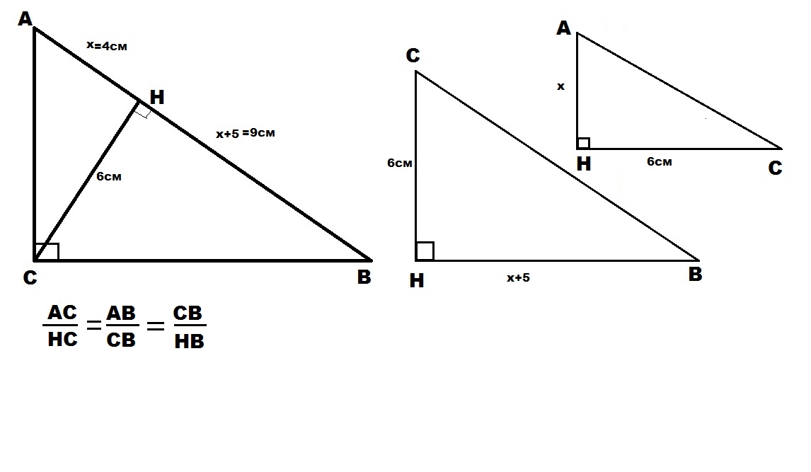 исходя из подобия в прямоугольном треугольнике имеем трАВС~CBH~ACH по 2 углам , следовательно АН/СН=НС/НВ х / 6= 6 / х+5 х(х+5)=36 х1=4,х2=-9( не удовлетвояет), отсюда АН=4см, НВ= 9см , АВ=13 см