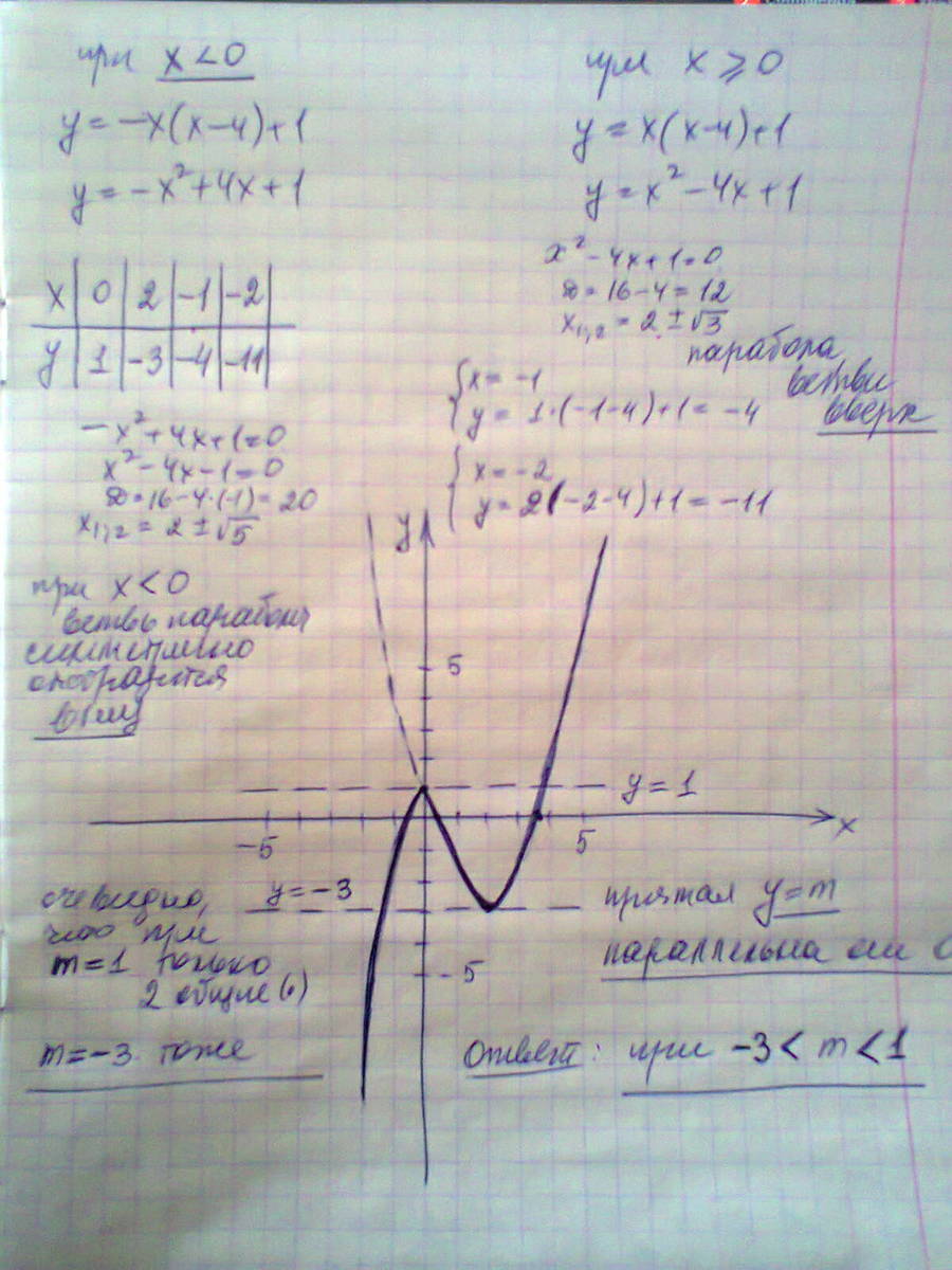 Срочно, помогите! - постройте график функции y=|x|(x-4)+1 и определить, при каких значениях m прямая y=m имеет с графиком ровно 3 общие точки.