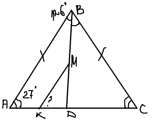 если нарисовать рисунок, то искомый угол MKD будет равен углу BAC = 27 гр. соответственные углы AB||MK при секущей AC.