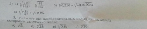 а) ⁷√(¹²⁸/₂₁₈₇) - ⁴√(⁸¹/₆₂₅)= ⁷√2⁷ - ⁴√3⁴ = 2/3 - 3/5 = 2*5-3*3 = 1/15