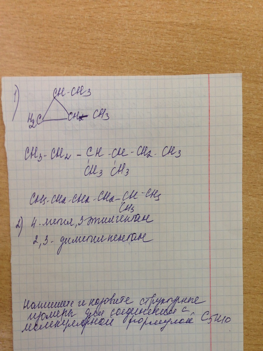 1) 1,2-диметилциклопропан ; 3,4-диметилгексан ; 2-метилгексан ; 2) Н3С-СН2-СН(C2H5)-CH(CH3)-CH2-CH2-CH3 ; H3C-CH(CH3)-CH(CH3)-CH2-CH3 ;