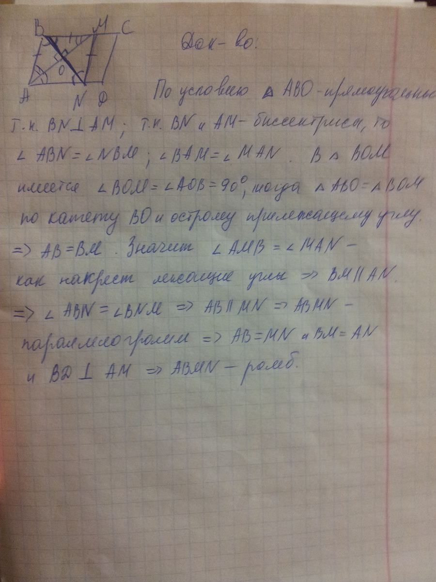 1.В четырехугольнике ABCD биссектриса угла А перпендикулярна биссектрисе угла В. Биссектриса угла А пересекает сторону ВС в точке М, а биссектриса угла В сторону AD в точке N. Докажите , что ABMN - ромб.
