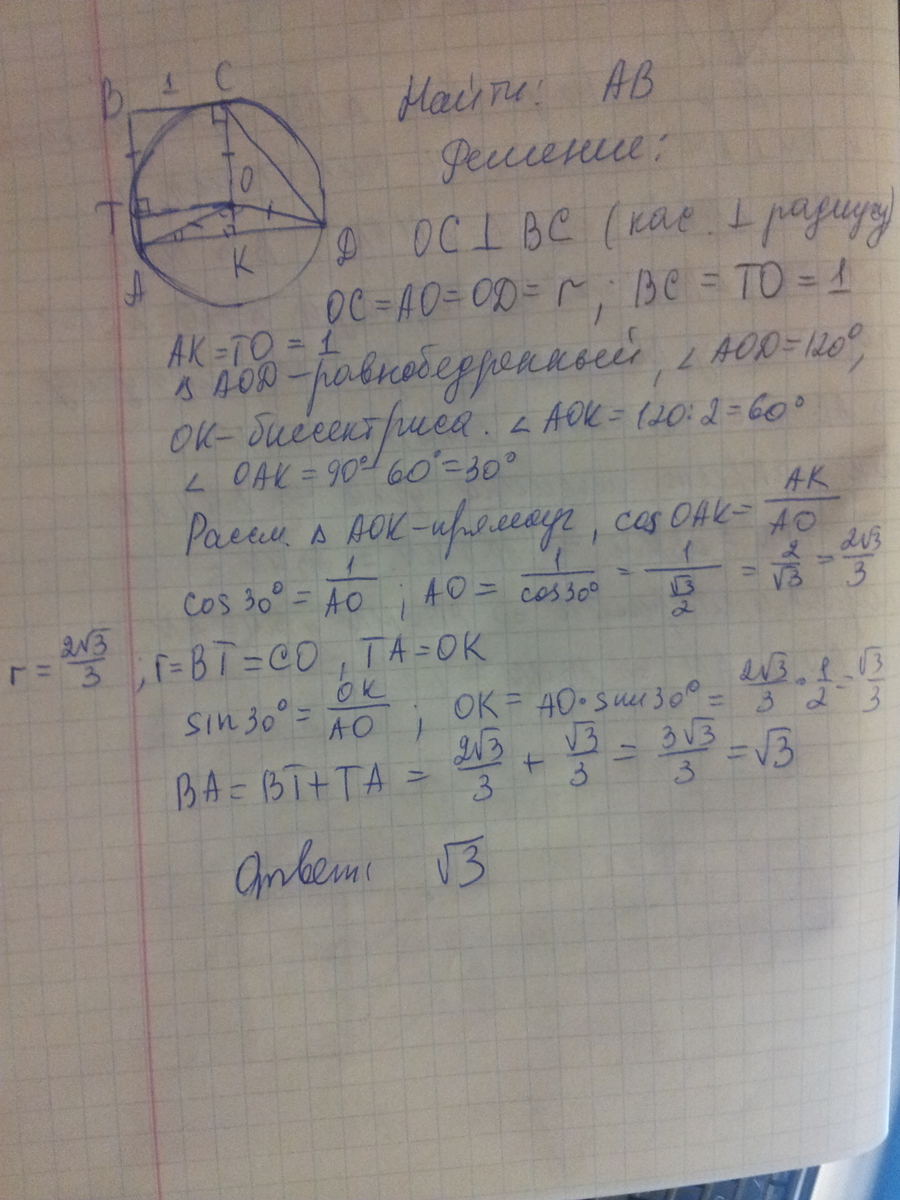 2.АВСД-прямоугольная трапеция с прямым углом А и меньшим основанием ВС=1. Окружность с центром в точке О касается прямой ВС в точке С и проходит через точки А и Д угол АОД=120 градусов.Найдите длину стороны АВ ,если известно ,что она больше радиуса этой окружности