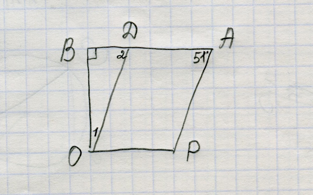 в трапеции APOB угол А=51 градус, угол В=90 градусов. прямая, параллельная стороне АР, проходит через вершину О и точку D на большем основании АВ. найдите острые углы треугольника ODB