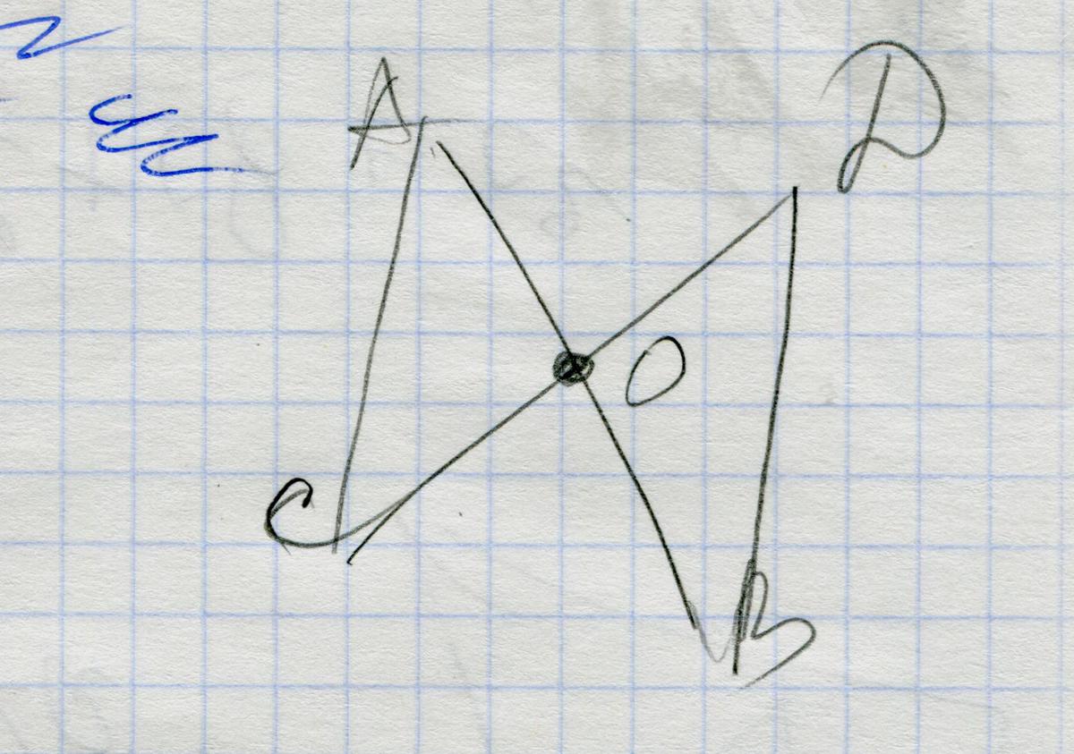 Т.к. О общая середина, то АО = ОВ и СО =ОД. Т.к. угол АОС и угол ВОД являются вертикальными > они равны. И далее по двум сторонам и углу между ними (АО = ОВ и СО = ОД И угол АОВ равен углу ВОД) Ч.т.д.