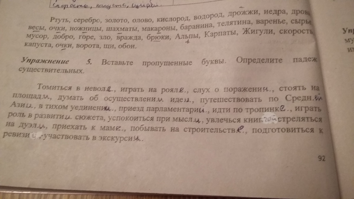 В неволе-предложный,на рояле-предложный падеж,слух-именительный,о поражение-предложный,на площади-предложный падеж,об осуществление-предложный,идеи-родительный,по Средней Азии-дательный падеж,в тихом уеденение-предложный падеж,принезд парламентарии-родительный падеж,