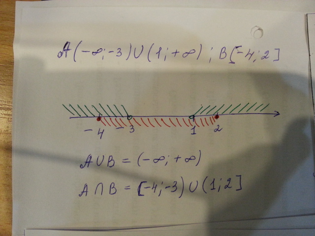 А=(-бесконечность,-3)U(1,+бесконечность) и В=([-4,2]