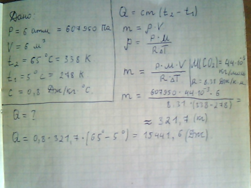 какое количество теплоты надо затратить чтобы 6 кубических метров газа co2 нагреть при постоянном давлении 6 атмосфер от 5 до 65 град.цель.,теплоемкость равна 0,8 кд/кг град цельс