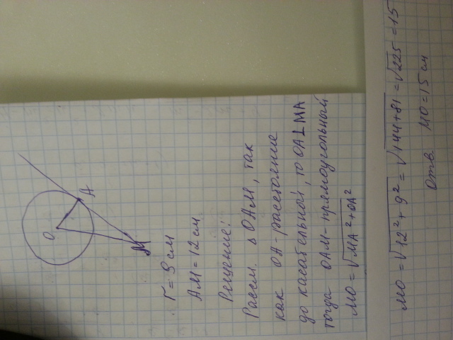 Из точки М, не лежащей на окружности, проведена касательная МА, где А точка касания. Найти расстояние от точки М до центра окружности, если радиус ее равен 9 см, а длина касательной АМ равна 12 см.