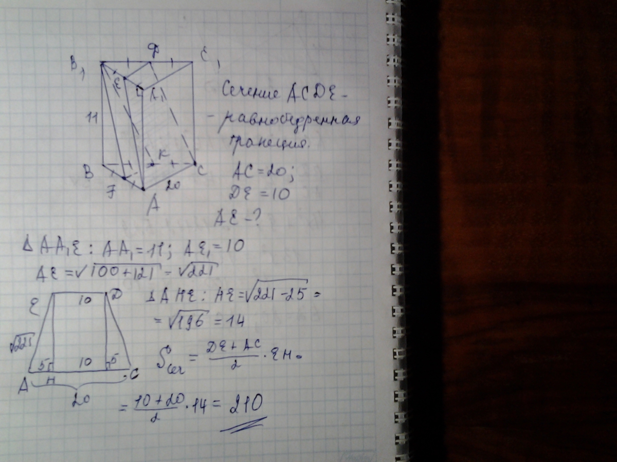 Точки K и F - середины ребер BC и AB правильной треугольной призмы ABCA1B1C1.Постройте сечение призмы плоскостью ,проходящей через вершину C и параллельной плоскости FKB1.Определите вид сечения и вычислите его площадь,если длина стороны основания равна 20 см, а бокового ребра -11 см.